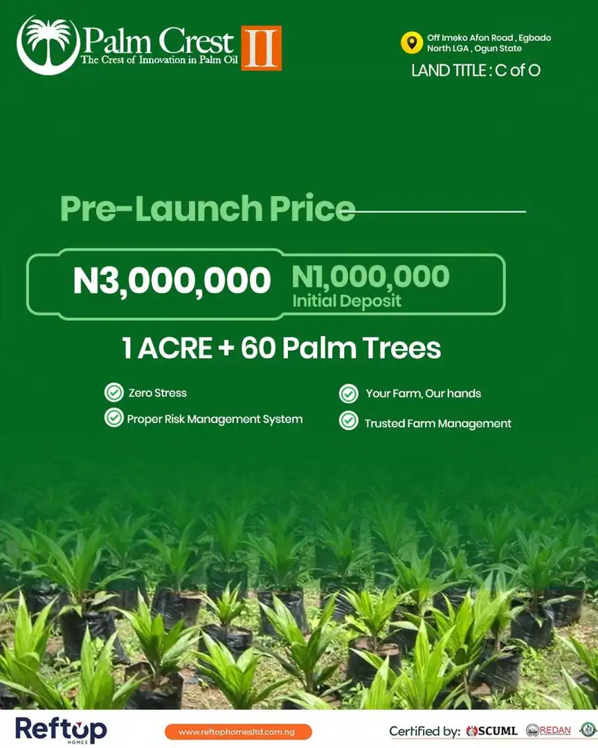 Developed by Reftop Homes Limited, Palm Crest is a fully structured oil palm estate located in Imeko Afon, Ogun State. Each plot comes with: